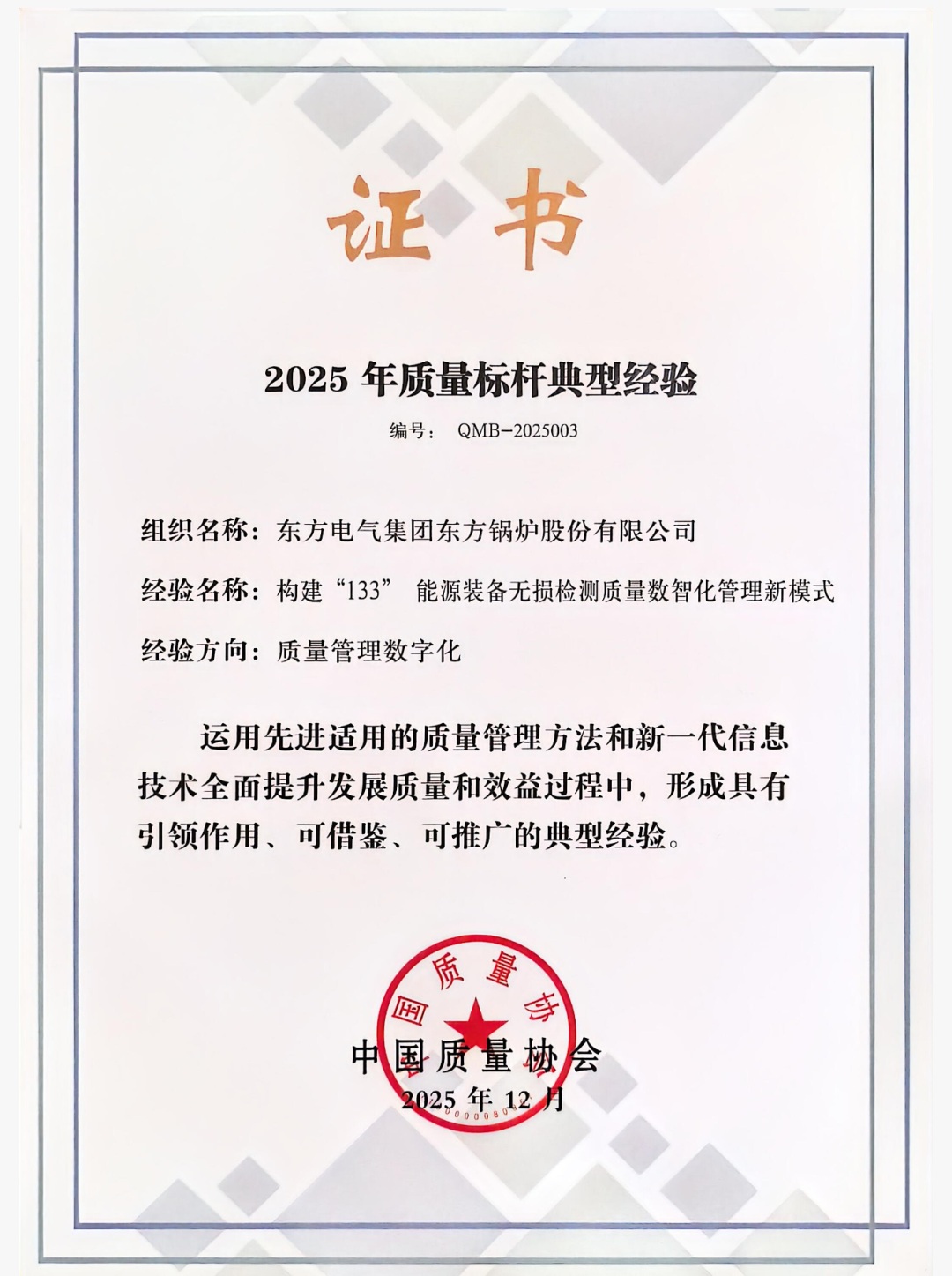 全國(guó)質(zhì)量標(biāo)桿是由工業(yè)和信息化部主導(dǎo),中國(guó)質(zhì)量協(xié)會(huì)組織評(píng)選的質(zhì)量領(lǐng)域國(guó)家級(jí)榮譽(yù),旨在遴選各行業(yè)質(zhì)量管理的先進(jìn)典范,推動(dòng)企業(yè)邁向產(chǎn)品卓越、品牌卓著、創(chuàng)新領(lǐng)先、治理現(xiàn)代的一流水平。東方鍋爐《構(gòu)建“133”能源裝備無(wú)損檢測(cè)數(shù)智化質(zhì)量管理新模式》喜獲質(zhì)量管理數(shù)字方向領(lǐng)域“全國(guó)質(zhì)量標(biāo)桿”,這也是東方鍋爐繼2024年來(lái)連續(xù)第二年獲得該獎(jiǎng)項(xiàng)。該項(xiàng)目立足能源裝備安全可靠性要求高、焊接結(jié)構(gòu)復(fù)雜、檢測(cè)難度大等行業(yè)特點(diǎn),全面構(gòu)建“一個(gè)目標(biāo)、三類(lèi)路徑、三大支撐”的質(zhì)量管理模式,聚焦“質(zhì)檢方式數(shù)字化、質(zhì)檢過(guò)程自動(dòng)化、結(jié)果評(píng)定智能化”三化突破,使質(zhì)量控制從“缺陷檢測(cè)”向“預(yù)防風(fēng)險(xiǎn)”、從“經(jīng)驗(yàn)判斷”向“智能決策”系統(tǒng)躍升。